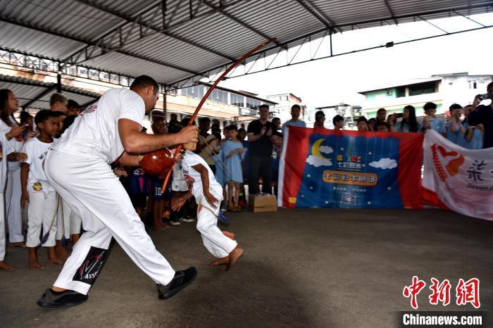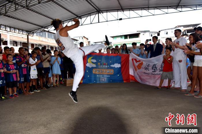 当地时间3月23日,巴西里约热内卢石头河社区,巴西“战舞”舞者为来自加拿大的华侨华人小朋友表演。 中新社记者 林春茵 摄