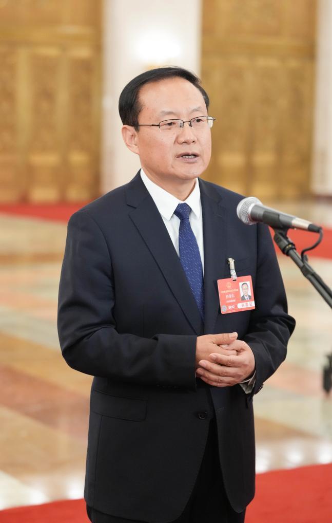 3月11日,第十四届全国人民代表大会第三次会议第三场“部长通道”集中采访活动在北京人民大会堂举行。这是文化和旅游部部长孙业礼接受媒体采访。新华社记者 郑焕松 摄