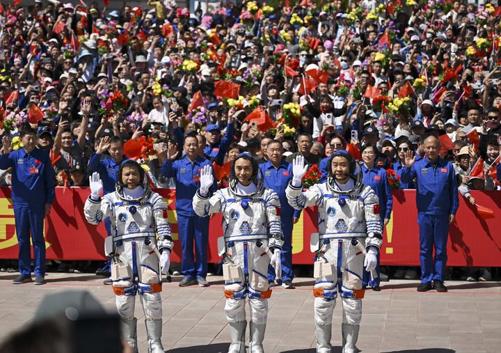 4月24日,神舟二十号载人飞行任务航天员乘组出征仪式在酒泉卫星发射中心问天阁圆梦园广场举行。这是航天员陈冬(右)、陈中瑞(中)、王杰在出征仪式上。新华社记者 连振 摄