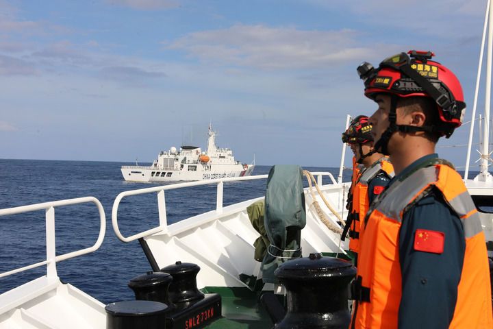 2月15日,中国海警万山舰舰载小艇返回母舰。当日,万山舰派出舰载小艇,为正在黄岩岛附近海域进行生产作业的我国渔船提供医疗援助。新华社发(翟一凡 摄)