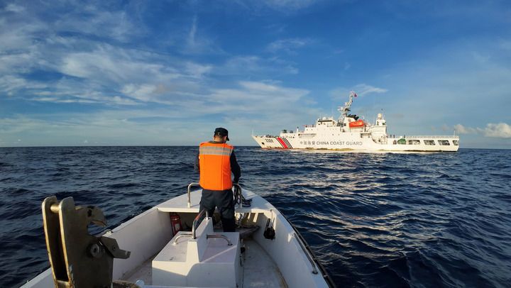 3月9日,中国海警万山舰执法员等待与达濠舰并靠时开展帆缆作业。新华社记者 凡帅帅 摄