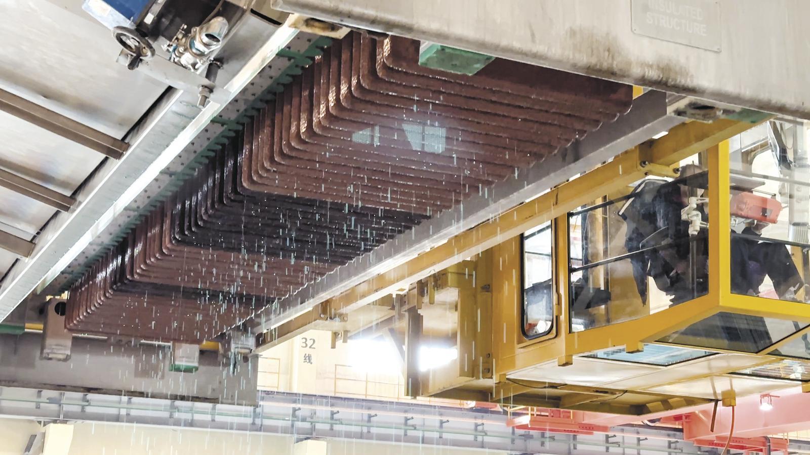青海铜业电解车间天车吊起阴极铜。
