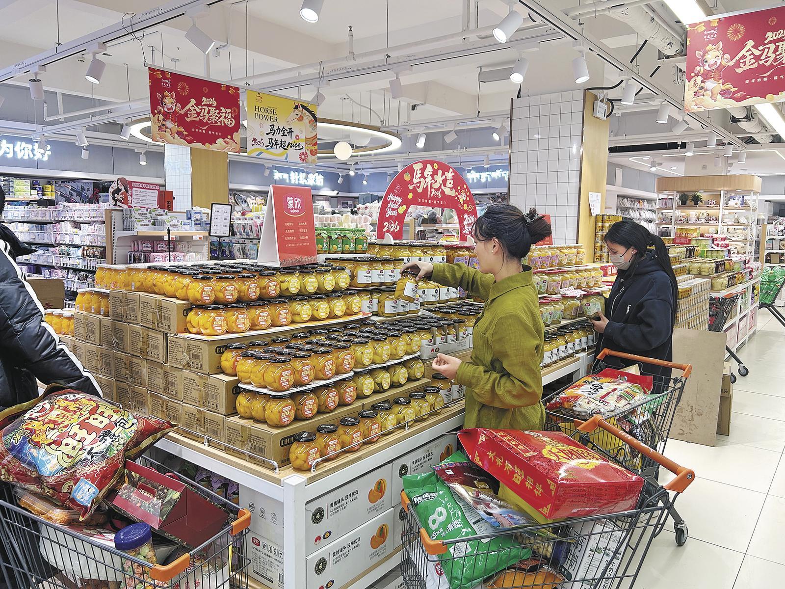 正在选购年货的江永,在他的购物车里既有给老人准备的酥油,也有给孩子买的零食和水果。“老罗的超市办得越来越好了,往年办年货要跑好几个地方,今年在超市里一次性就能买全喽!”江永点开手机里的消费券核销记录,笑着说:“我已经领了3张券,今天买的这箱红酒,比平时便宜不少。”