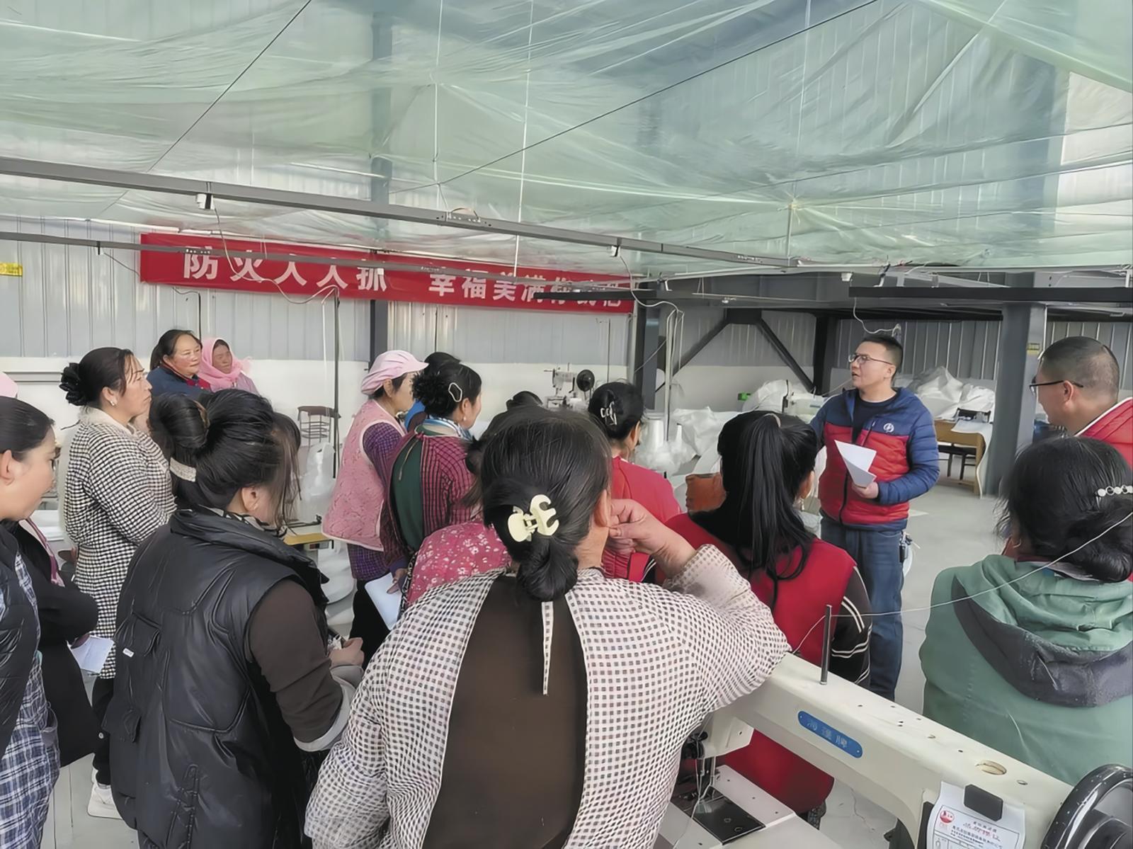 互助土族自治县威远镇古城村党支部书记吉国兴在集装袋加工车间讲解政策。海东市委组织部供图