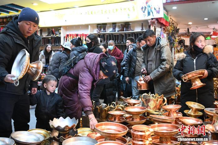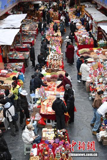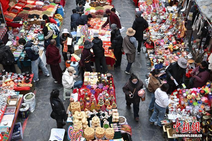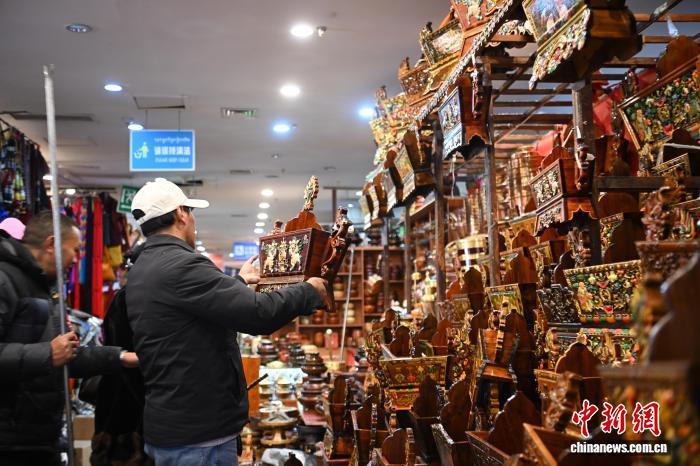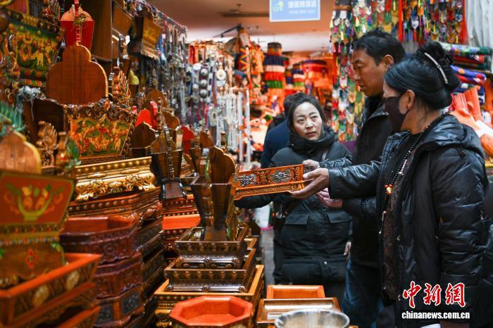 中国藏族网通讯 2月9日,随着春节、藏历新年临近,西藏拉萨市八廓商城等年货市场人头攒动。市民忙着挑选酥油花、香布、切玛盒等传统年货,市场内购销两旺、喜庆热闹,古城拉萨处处洋溢着浓厚的节日氛围。图为市民在八廓商城选购年货切玛盒。中新社记者 贡嘎来松 摄
