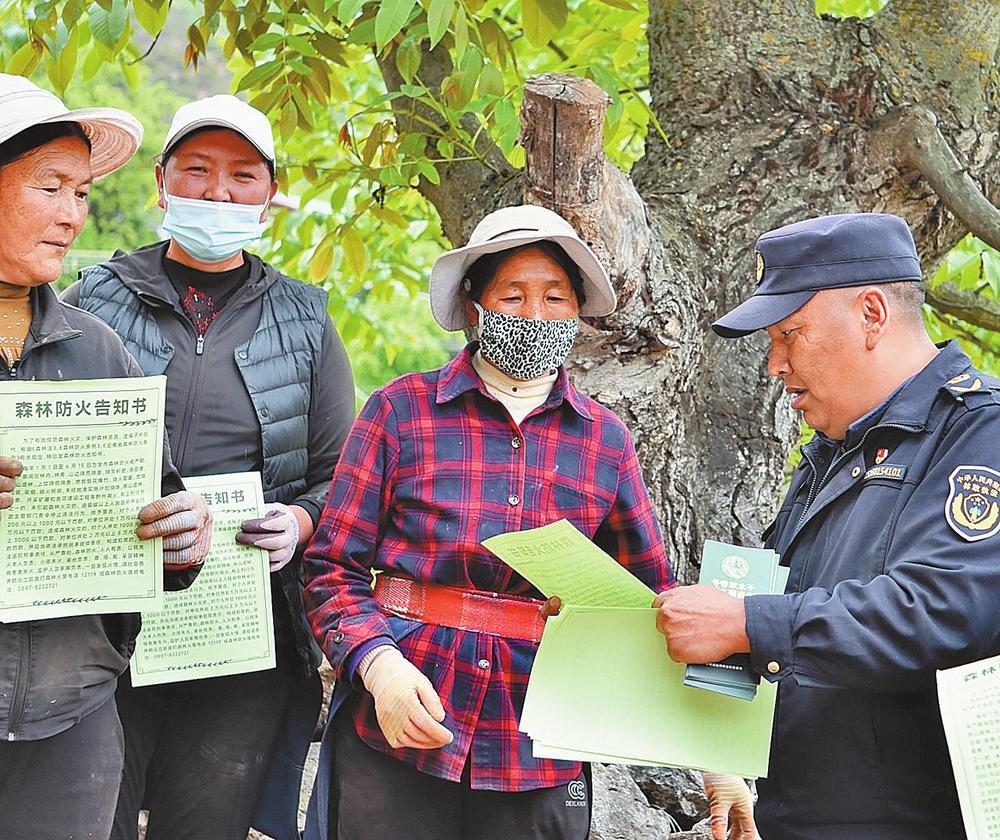 江巴次成(右)向村民宣讲防火知识。 本报记者 贡秋次仁 摄