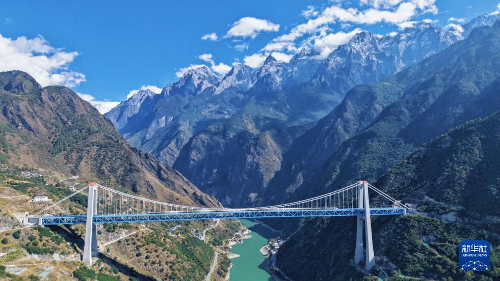 这是11月21日拍摄的虎跳峡金沙江铁路大桥。大桥全长882.5米,起于玉龙雪山隧道出口,止于哈巴雪山隧道进口,是丽香铁路的重点控制性工程(无人机照片)。新华社 杨紫轩 摄