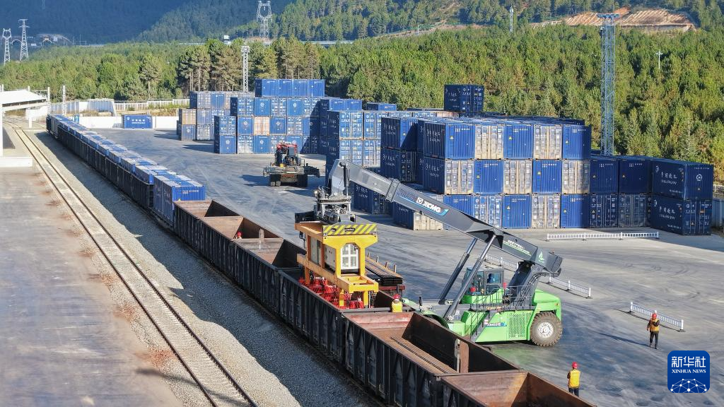 11月21日,工人在云南迪庆藏族自治州小中甸货场进行装卸作业(无人机照片)。新华社 杨紫轩 摄