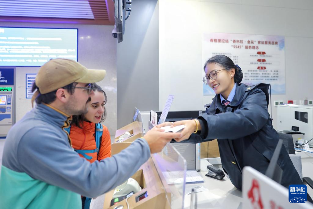 11月18日,外籍旅客在云南香格里拉站“香巴拉·金花”服务台购票。车站为旅客提供“一站式”出行服务。新华社 杨紫轩 摄