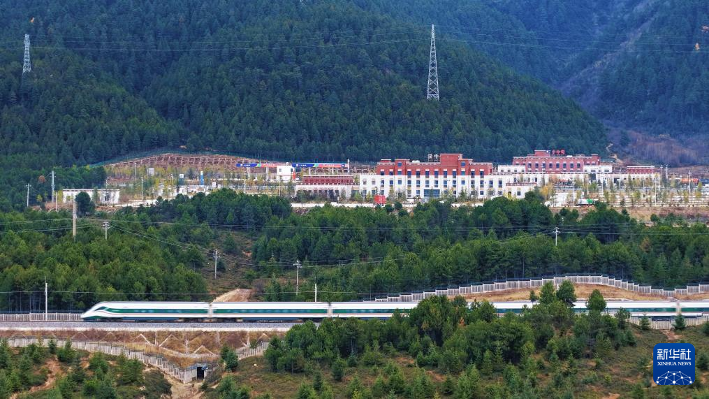 11月21日,一列动车组列车驶过云南迪庆藏族自治州小中甸站(无人机照片)。新华社 杨紫轩 摄