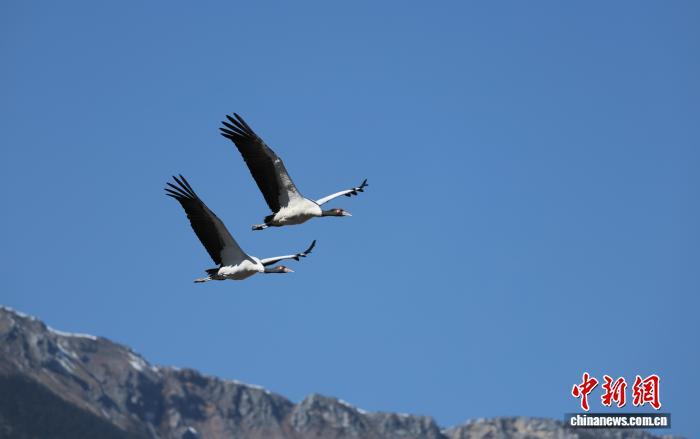 1月22日,两只黑颈鹤在香格里拉市的纳帕海上空飞翔。黄兴鸿 摄