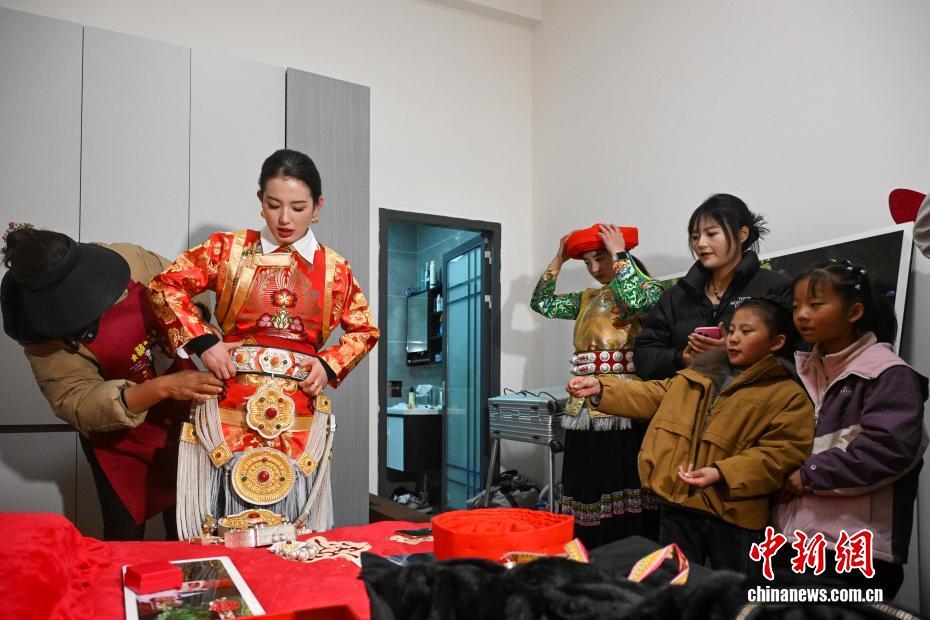 图为好友为扎史永宗穿戴传统藏式婚服。中新社记者 李嘉娴 摄