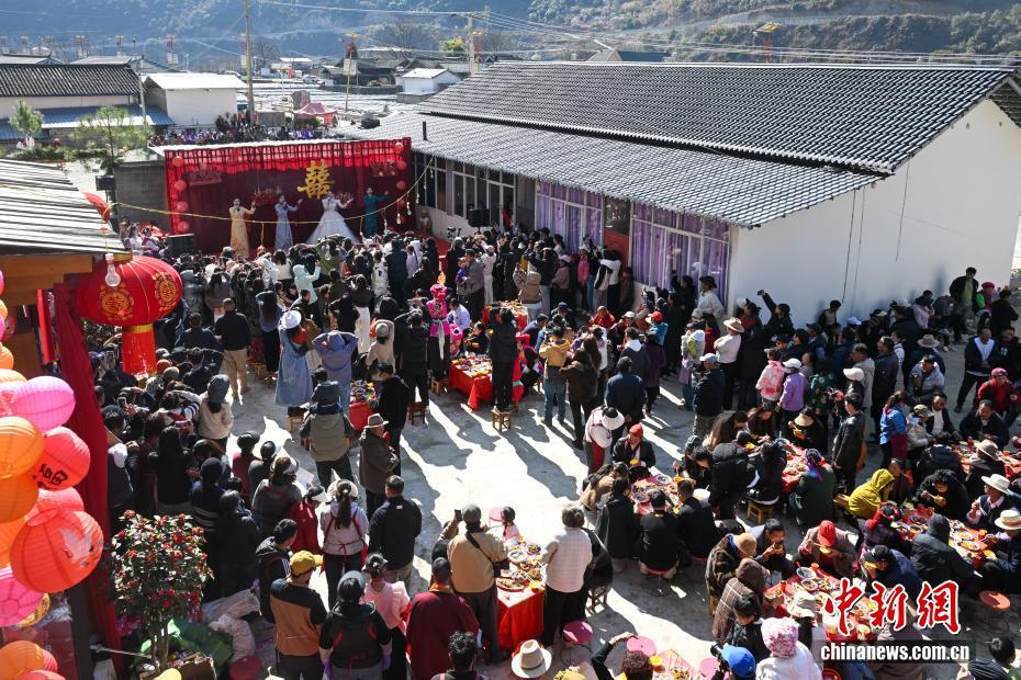 图为前来参加婚礼的亲朋好友与网友一同品味藏餐,为婚礼献上祝福。中新社记者 李嘉娴 摄