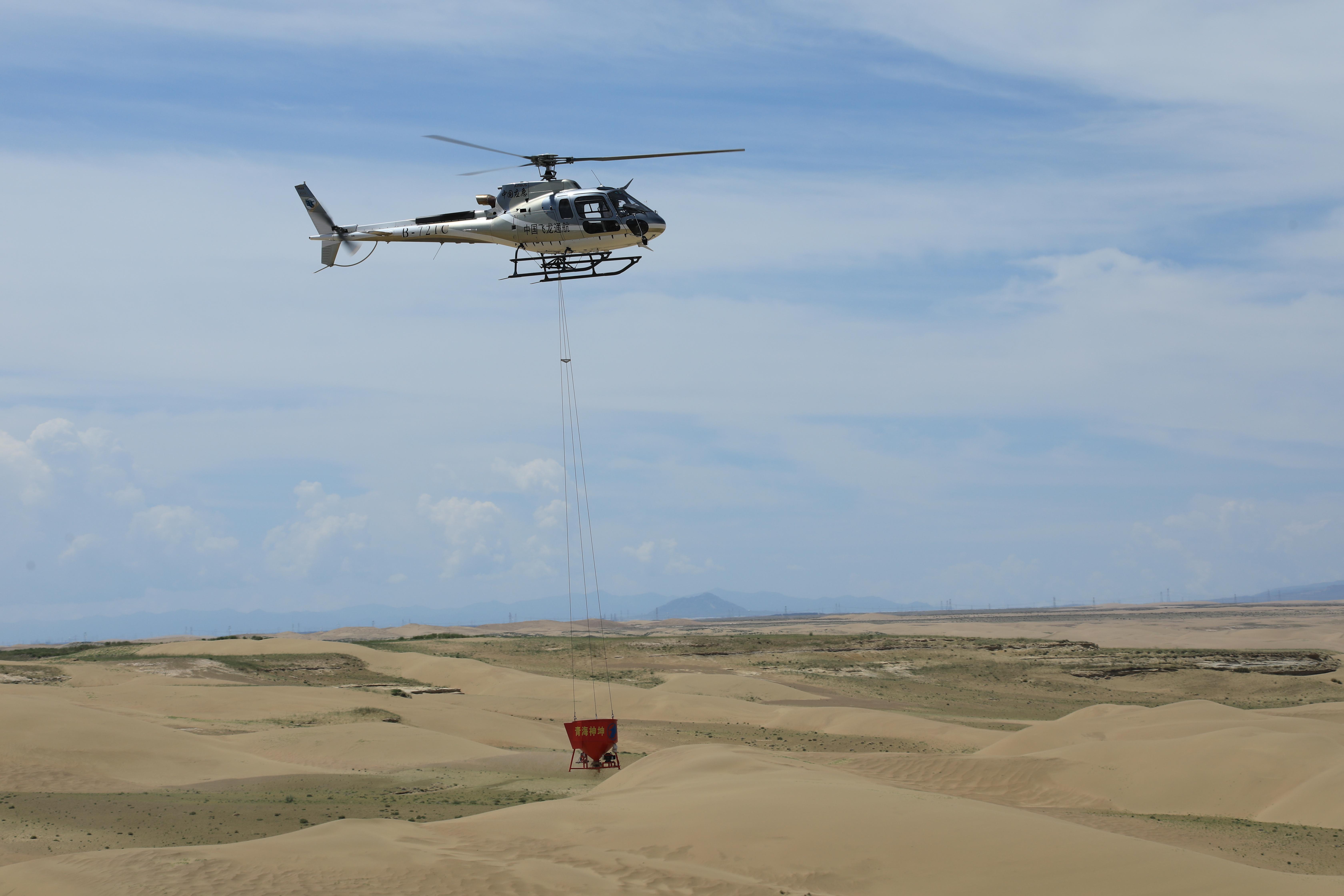 2020年7月,贵南县在这片封禁保护区首次采用直升机与无人机相结合的方式开展飞播造林。在那次飞播造林工程任务中,直升机共飞行287架次,划分作业区为2个播区,造林面积1万公顷,播披碱草、沙蒿种子9.05万公斤。