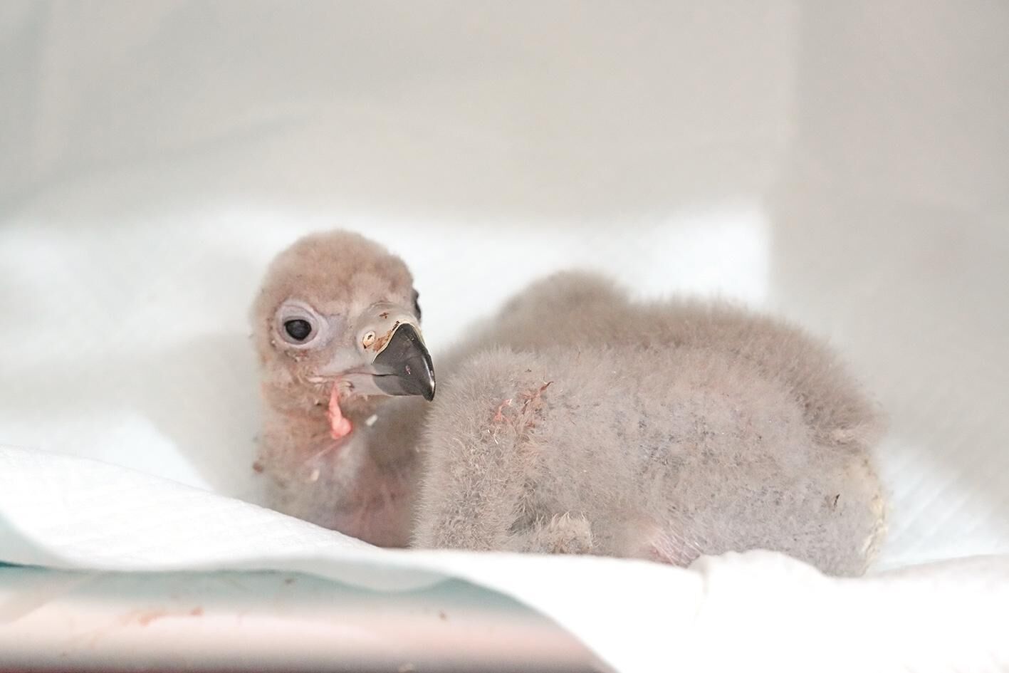 “小煤球”从壳里取出时180克,体重基本正常,但叫声无力、乞食行为不明显,体况虚弱,状态不佳。工作人员将其放入动物恒温保育箱(动物ICU)中,开始了长达20天的24小时不间断护理。至4月24日,秃鹫雏鸟破壳3周,体重达到750克,发育正常,脱离危险,工作人员在天晴时开始带秃鹫雏鸟外出晒太阳。