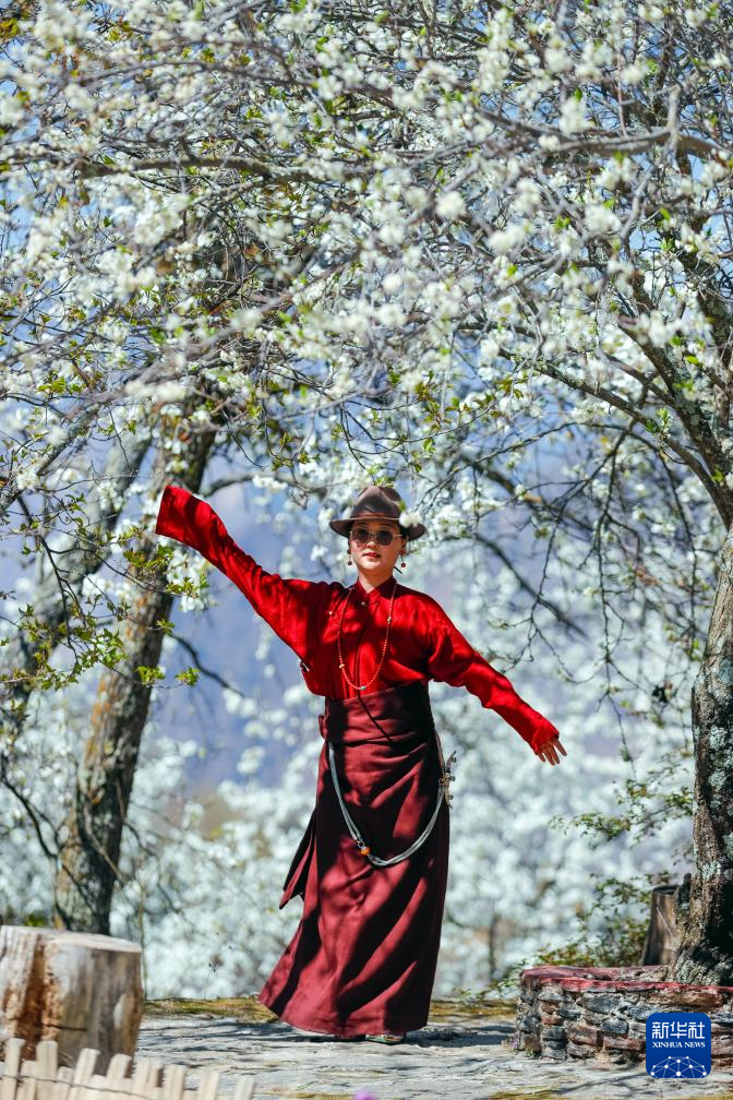 3月23日,在丹巴县中路藏寨的“贰喜·班莫的家”民宿,来自康定的游客在梨花下跳舞。新华社记者 沈伯韩 摄