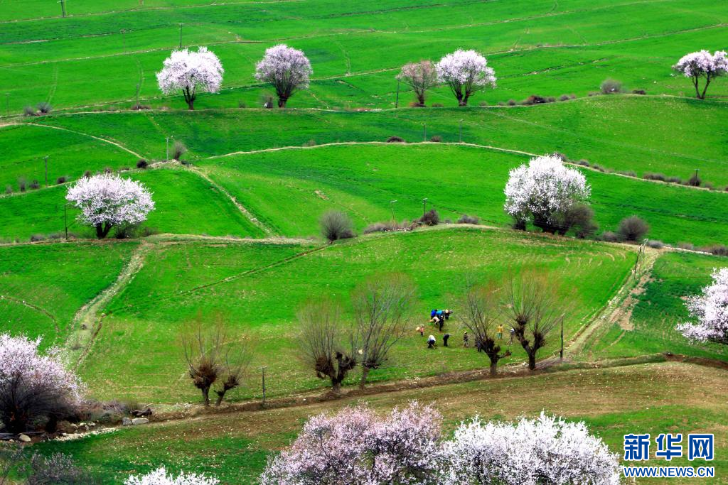 图为西藏波密县倾多镇巴康村内,桃花映衬下的绿草。新华网发 阿旺仁青 摄