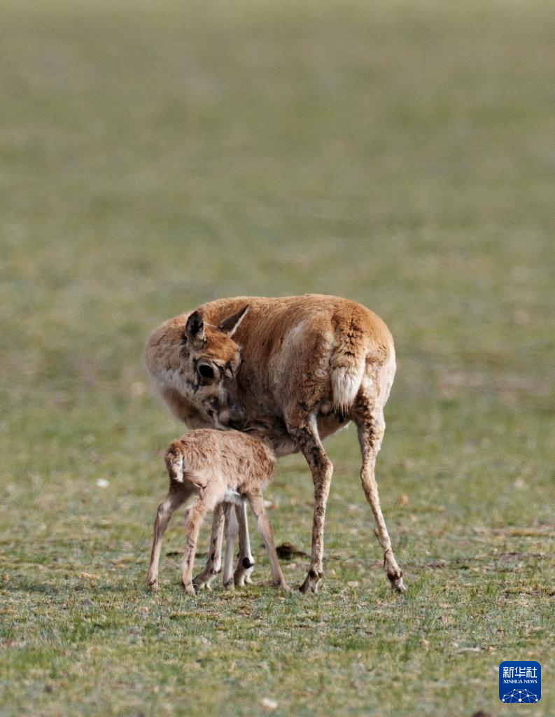 鲁确塘草原上,藏羚羊妈妈守护着刚出生的小藏羚羊(6月16日摄)。新华社记者 旦增尼玛曲珠 摄