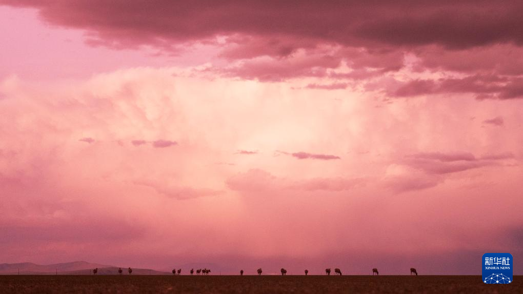 晚霞中鲁确塘草原上待产的藏羚羊(6月16日摄)。新华社记者 费茂华 摄