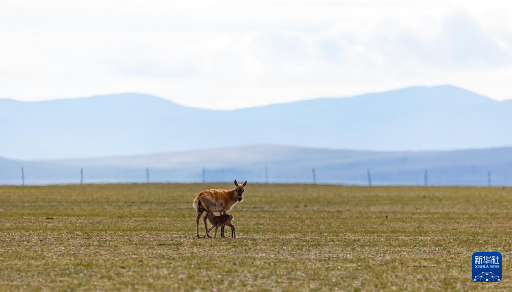 鲁确塘草原上的藏羚羊母子(6月16日摄)。新华社记者 旦增尼玛曲珠 摄