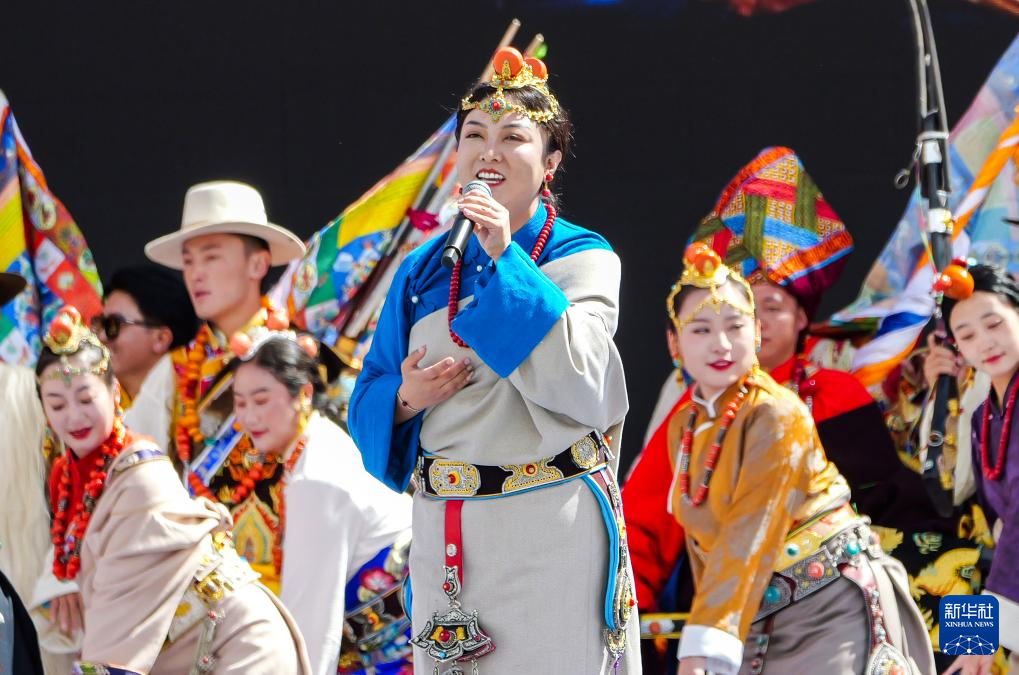 9月15日,类乌齐县群众表演非物质文化遗产岭卓舞。新华社记者 格桑朗杰 摄