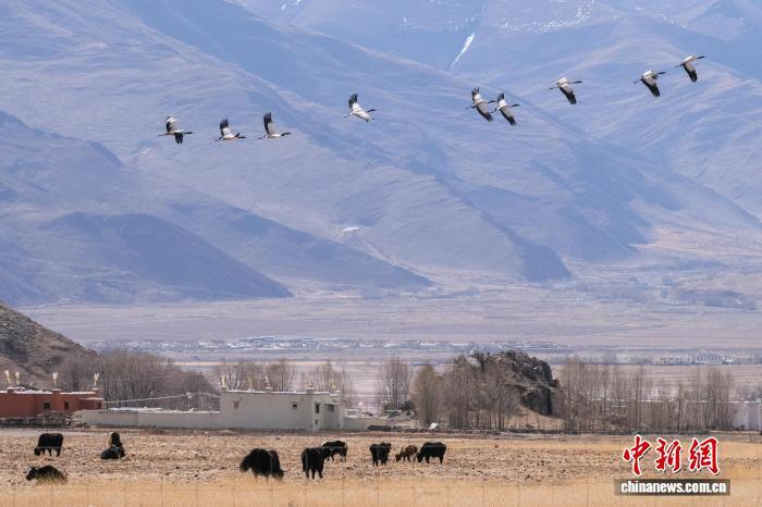 图为2月8日,翱翔的黑颈鹤群与高原牦牛以及村落组成一幅优美的画面。江飞波 摄