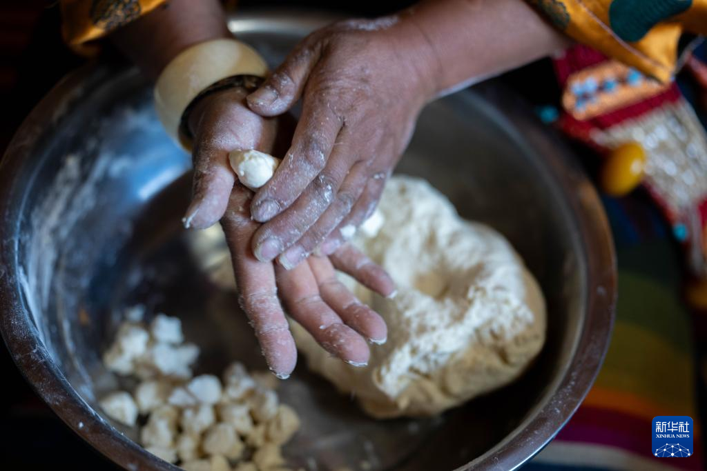 2月16日,长所乡古荣村村民卓玛次仁在制作年节食品“古突”。在藏语中,“古”意为“九”,“突”意为“面”,“古突”是一种用牦牛肉汤加入牛肉、萝卜、奶渣等食材熬煮的面食。按西藏传统习俗,“古突”夜,家家户户迎来团聚,一起享用“古突”。新华社记者 旦增尼玛曲珠 摄