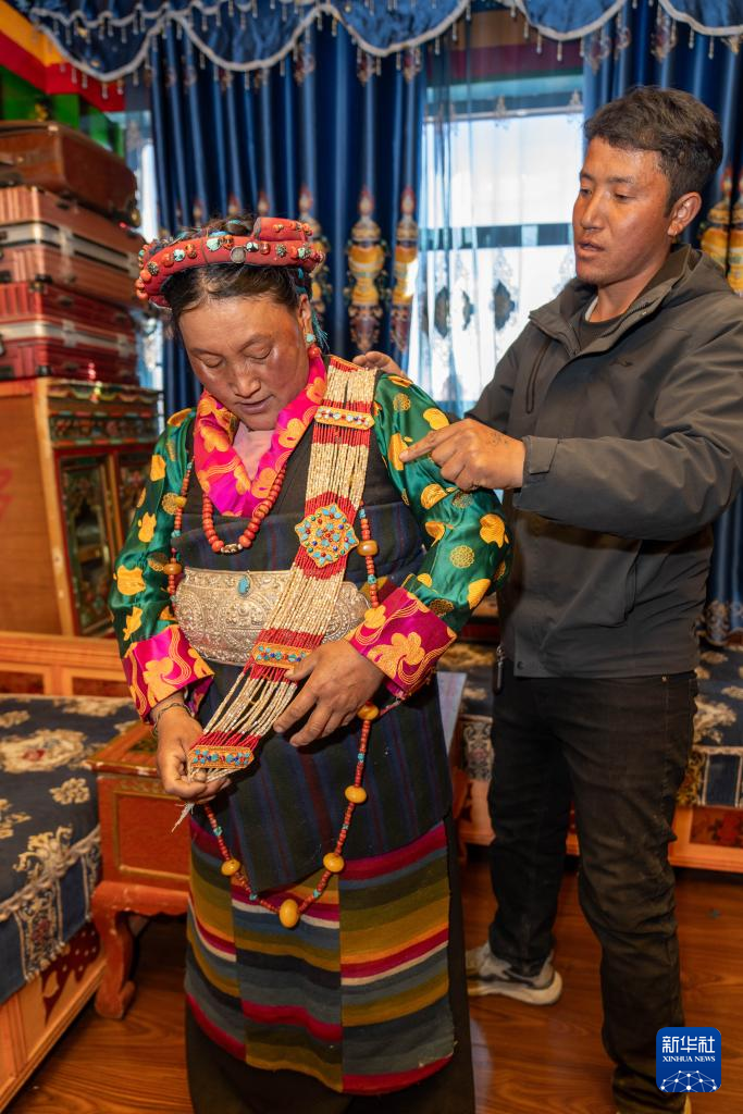 2月16日,长所乡古荣村村民桑杰(右)给爱人卓玛次仁佩戴首饰。新华社记者 旦增尼玛曲珠 摄