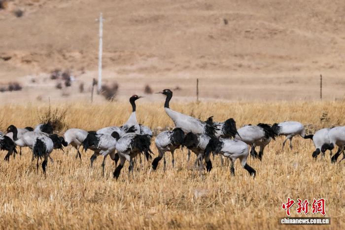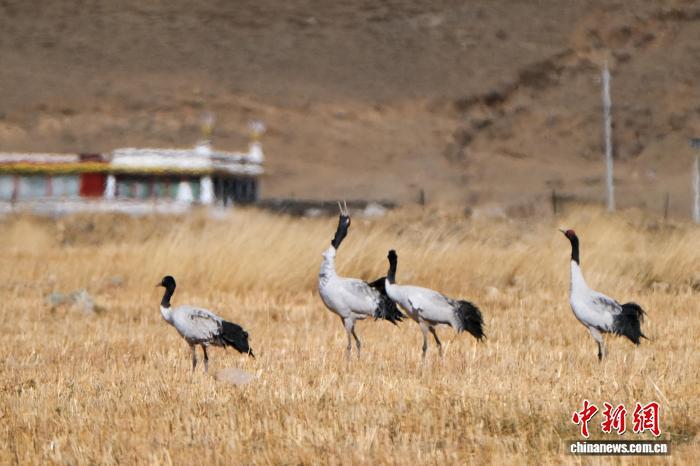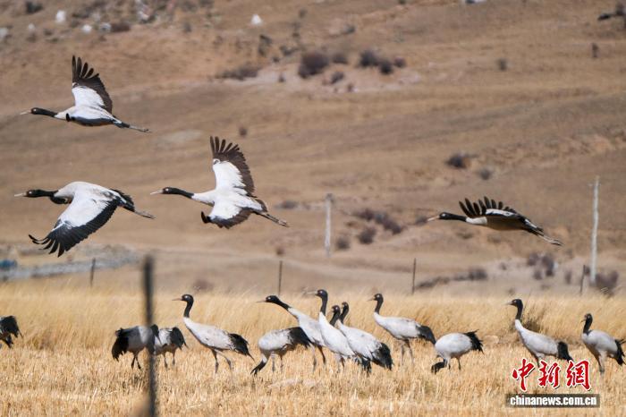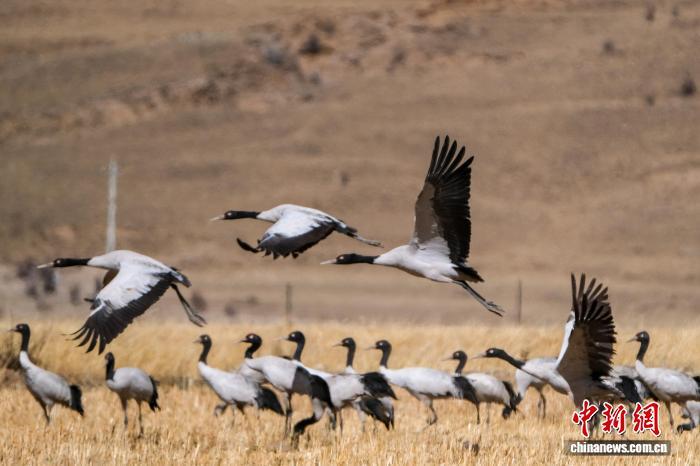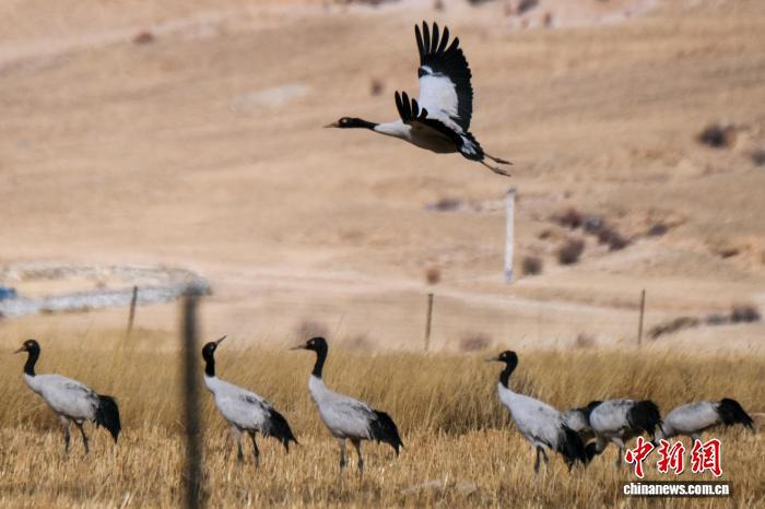 黑颈鹤是中国国家一级保护动物,是唯一生活、繁殖在高原的鹤类,被藏族民众誉为“吉祥鸟”。近日,西藏自治区拉萨市林周县林业和草原局介绍,作为黑颈鹤重要的越冬栖息地,今年该县境内黑颈鹤数量在1800只至2300只之间,其中虎头山水库卡东村一带占比约一半。中新网记者在周边看到,不少黑颈鹤在田间觅食,不时飞翔于高原农田、村落上空,舞动的鹤影和声声鹤鸣为冬春时节的高原增添了几分灵动。